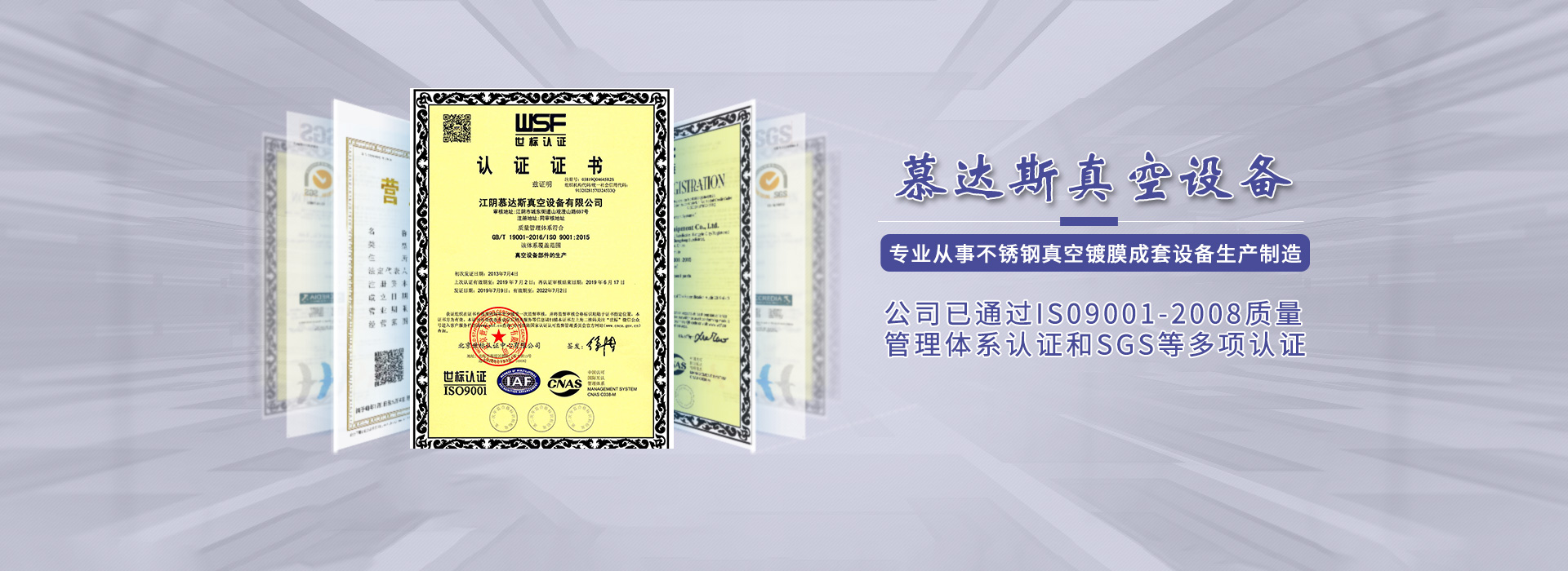 江陰慕達斯真空設備有限公司成立于2011年,是一家專業(yè)從事不銹鋼真空鍍膜成套設備、不銹鋼管道、不繡鋼設備;水處理設備的設計、制造及大型鋼構件設計、制造、銷售、安裝。它地處風景秀麗、素稱“全國百強縣之首”的江陰市山觀工業(yè)開發(fā)區內,南依“蘇、錫、常”,北臨江陰長江大橋,新長鐵路、錫澄高速,滬寧高速公路貫穿全程,交通運輸及為便利......